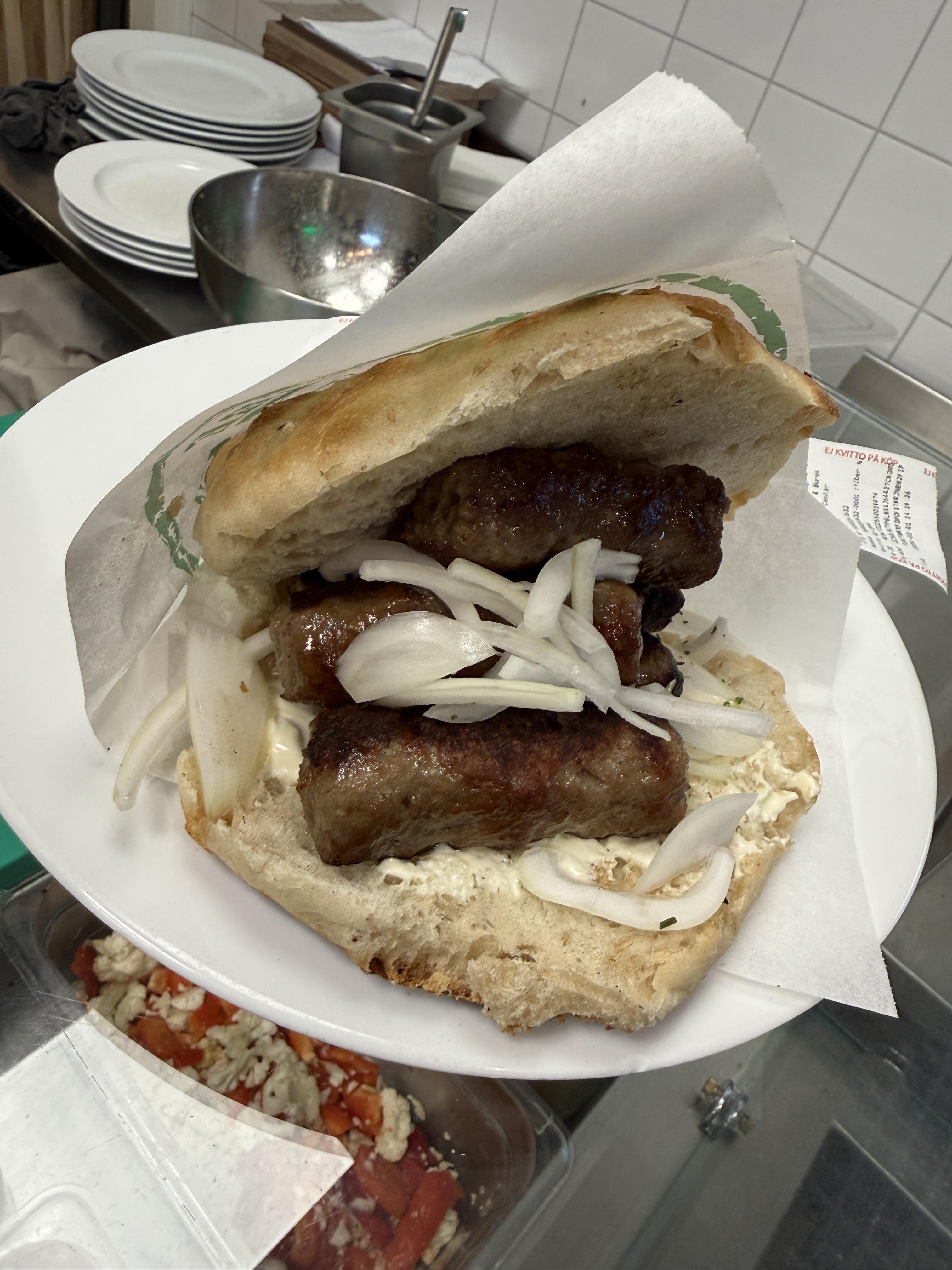 Små rullade grillspett av nötkött, kryddade med traditionella smaker och serverad i lepinja-bröd, lök, sallad och kajmak.