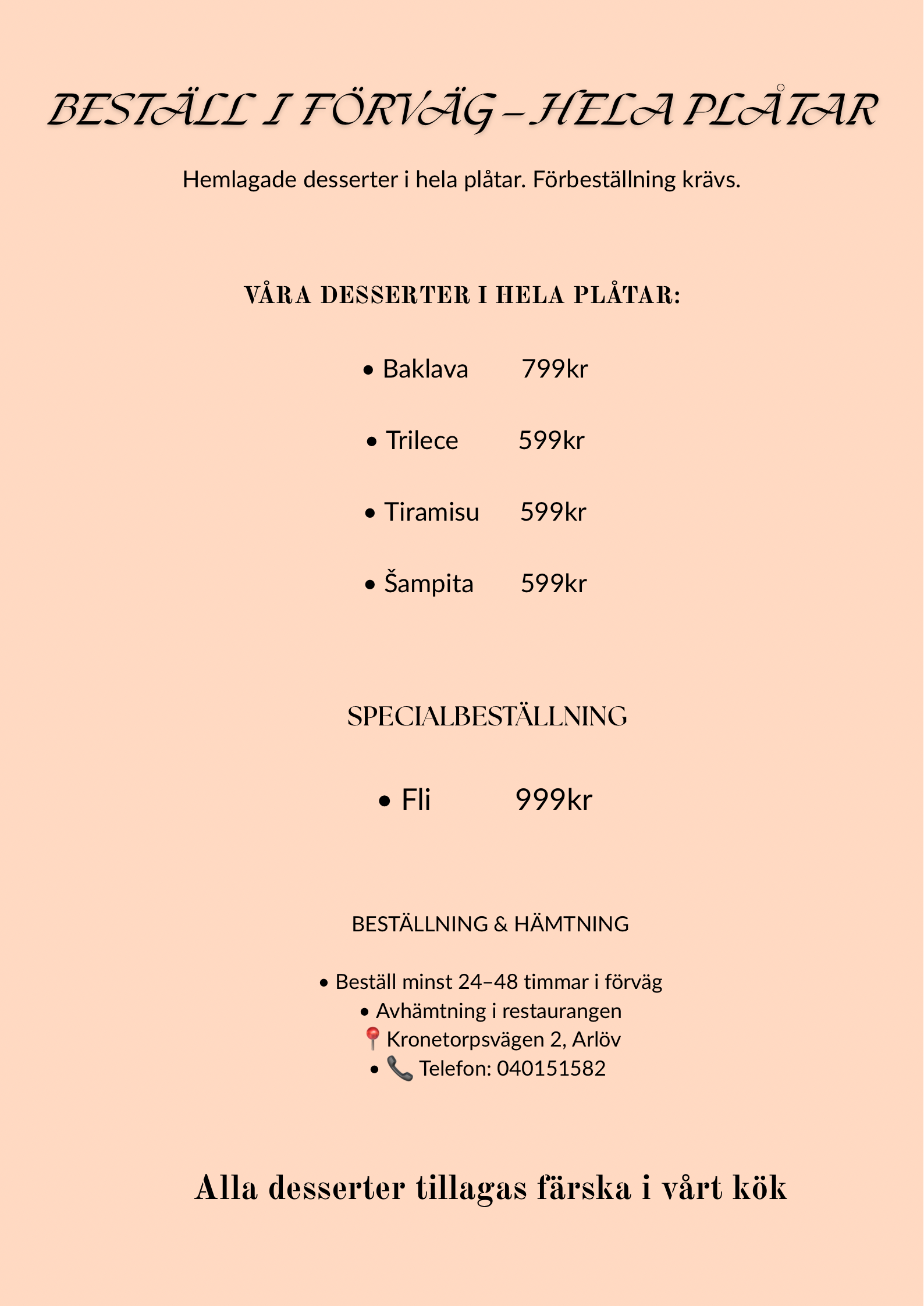 Beställ våra hemlagade desserter i hela plåtar - perfekt för event, familjefester och företag.